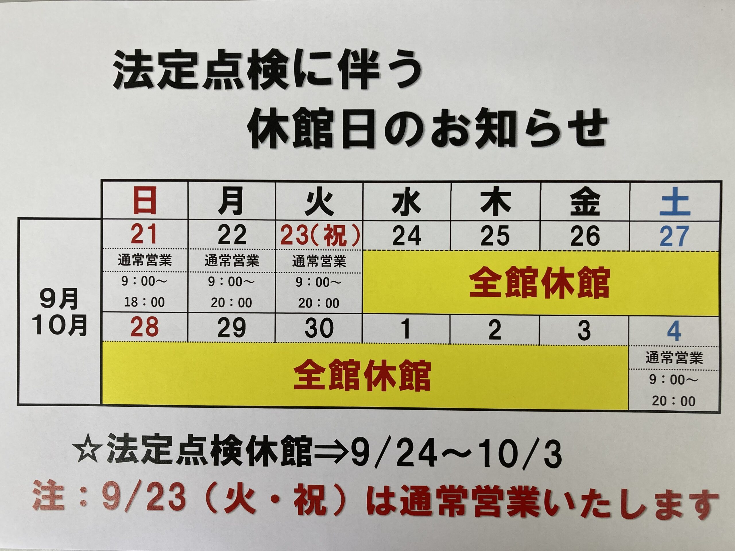 9月24日(水)~10月3日(金)は法定点検に伴い全館休館